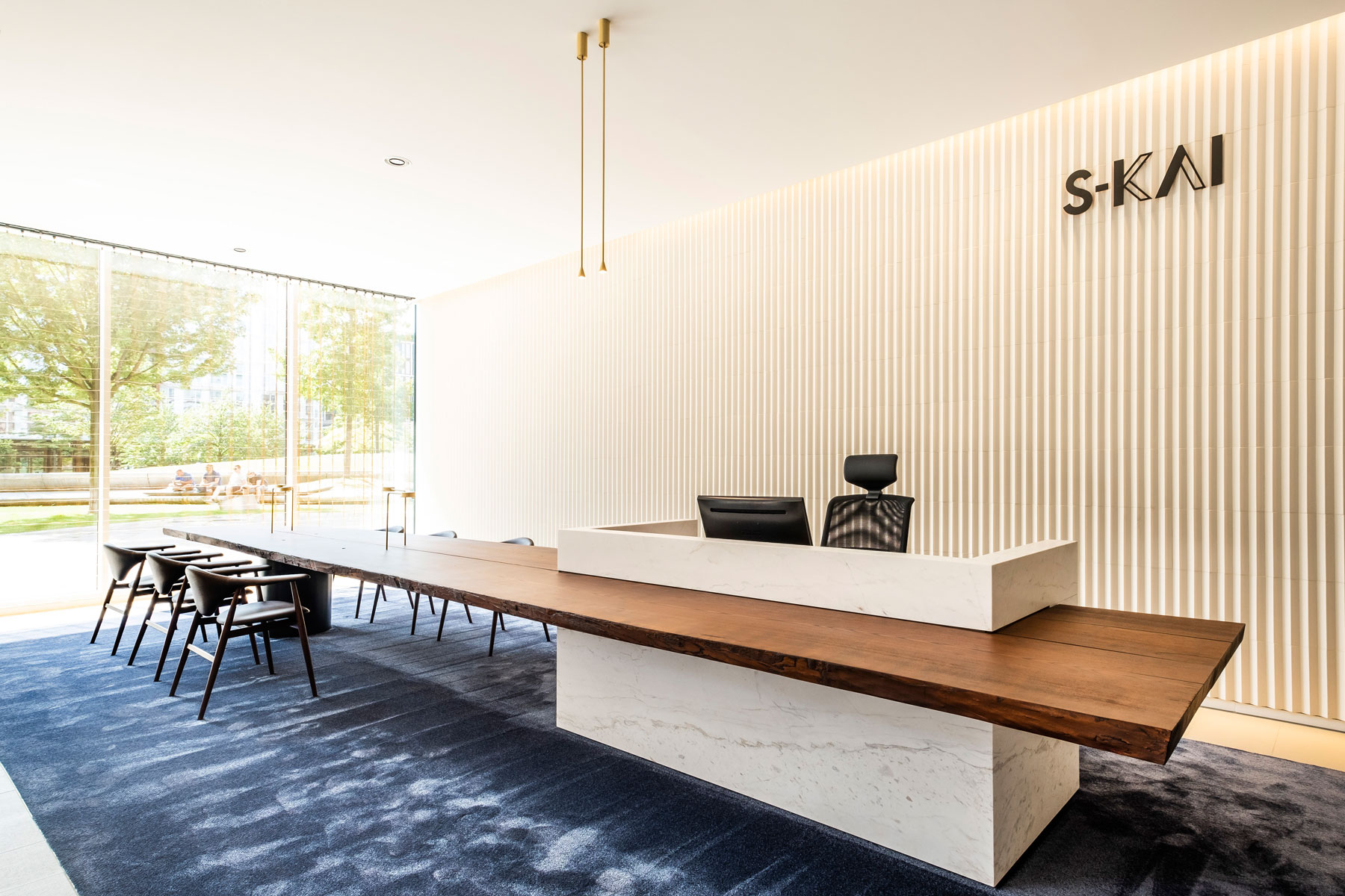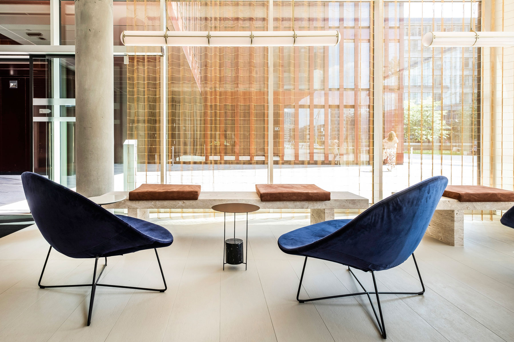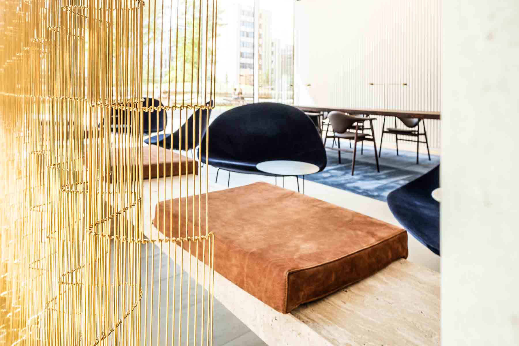 Den hellen Naturtöne des Fußbodens, der Bänke aus Travertin-Naturstein und der Wandbespannung kontrastieren mit dem tiefen kühlen Blau der Sessel „Isola Chair“ von Tacchini und dem Teppich von „van besouw“. Zusammen mit der transluzenten Lichtstimmung die das Japan-inspirierte Vorhangsystem von „kriskadecor“ erzeugt, entsteht eine Atmosphäre, die ganz unterschiedlichen Anforderungen entgegenkommt.