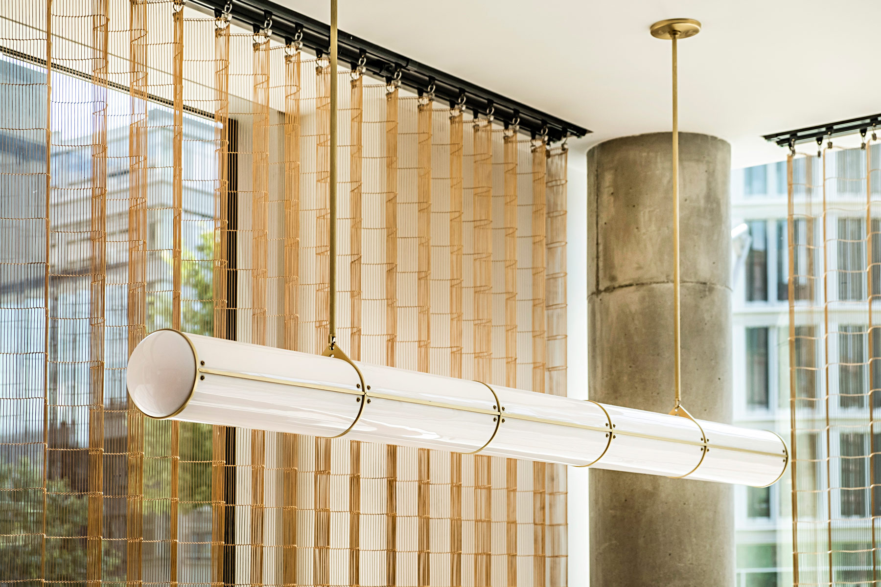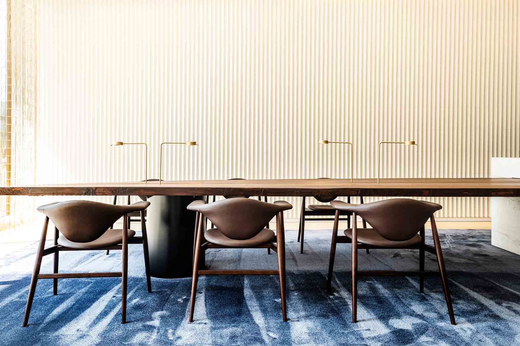 Die verschiedenen Zonen laden ein zum Ankommen, Durchatmen oder Pausieren während der Meetings, zum ungezwungenen Austausch mit Kollegen oder Geschäftspartnern und ermöglichen gleichermaßen das konzentrierte Arbeiten oder Gespräch an dem großen maßgefertigten Holztisch aus Esche mit den schlichten, filigranen Chipperfield Tischleuchten von Wästberg W102.