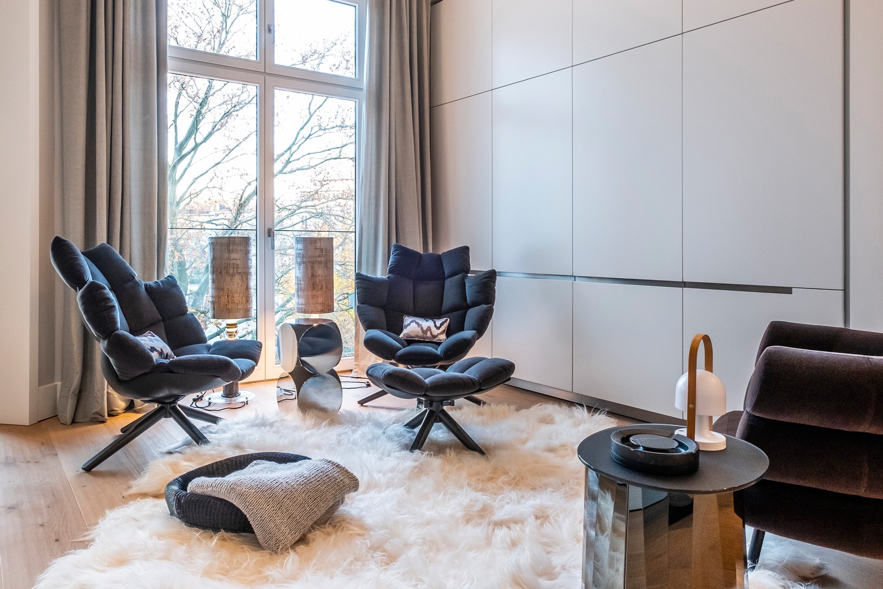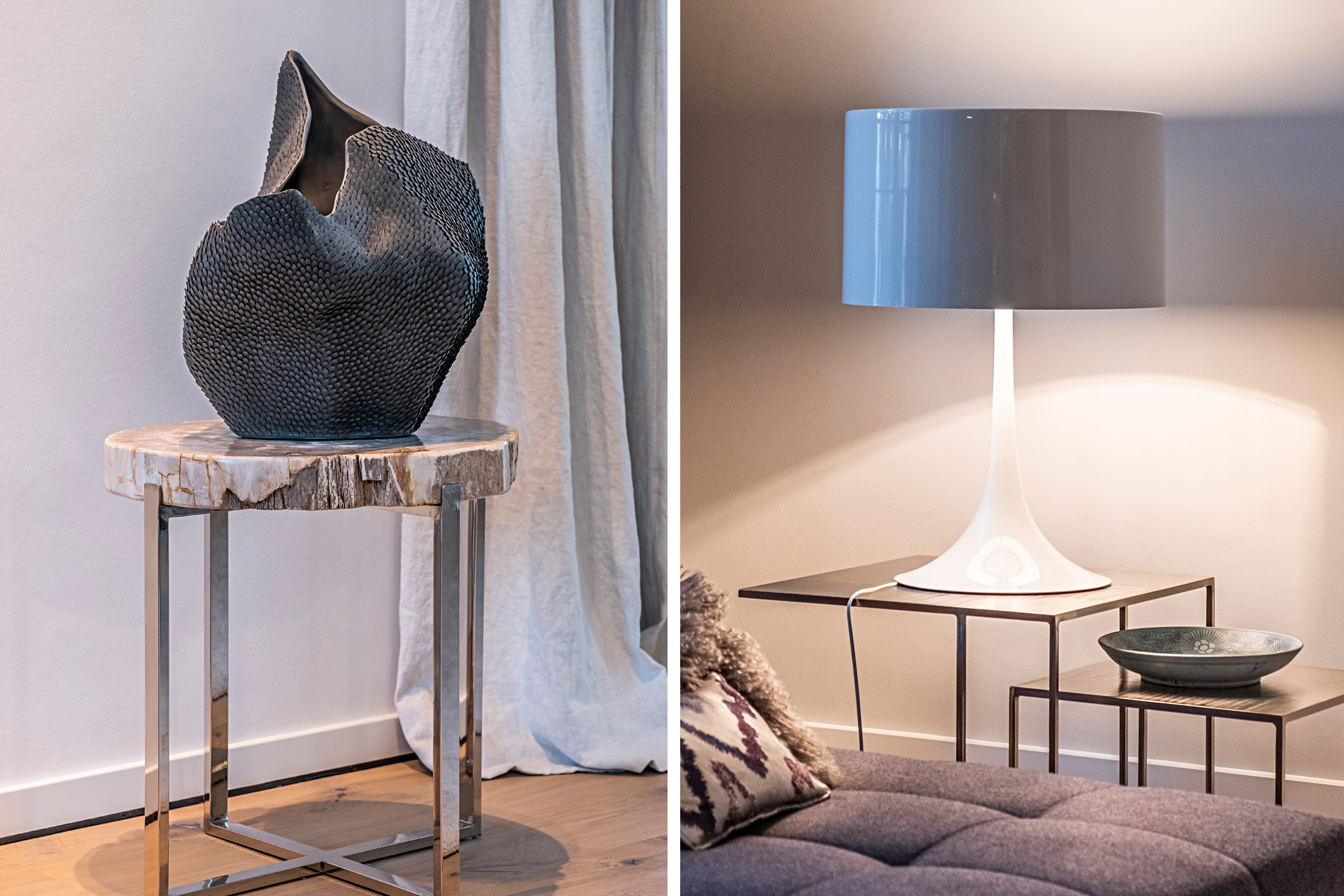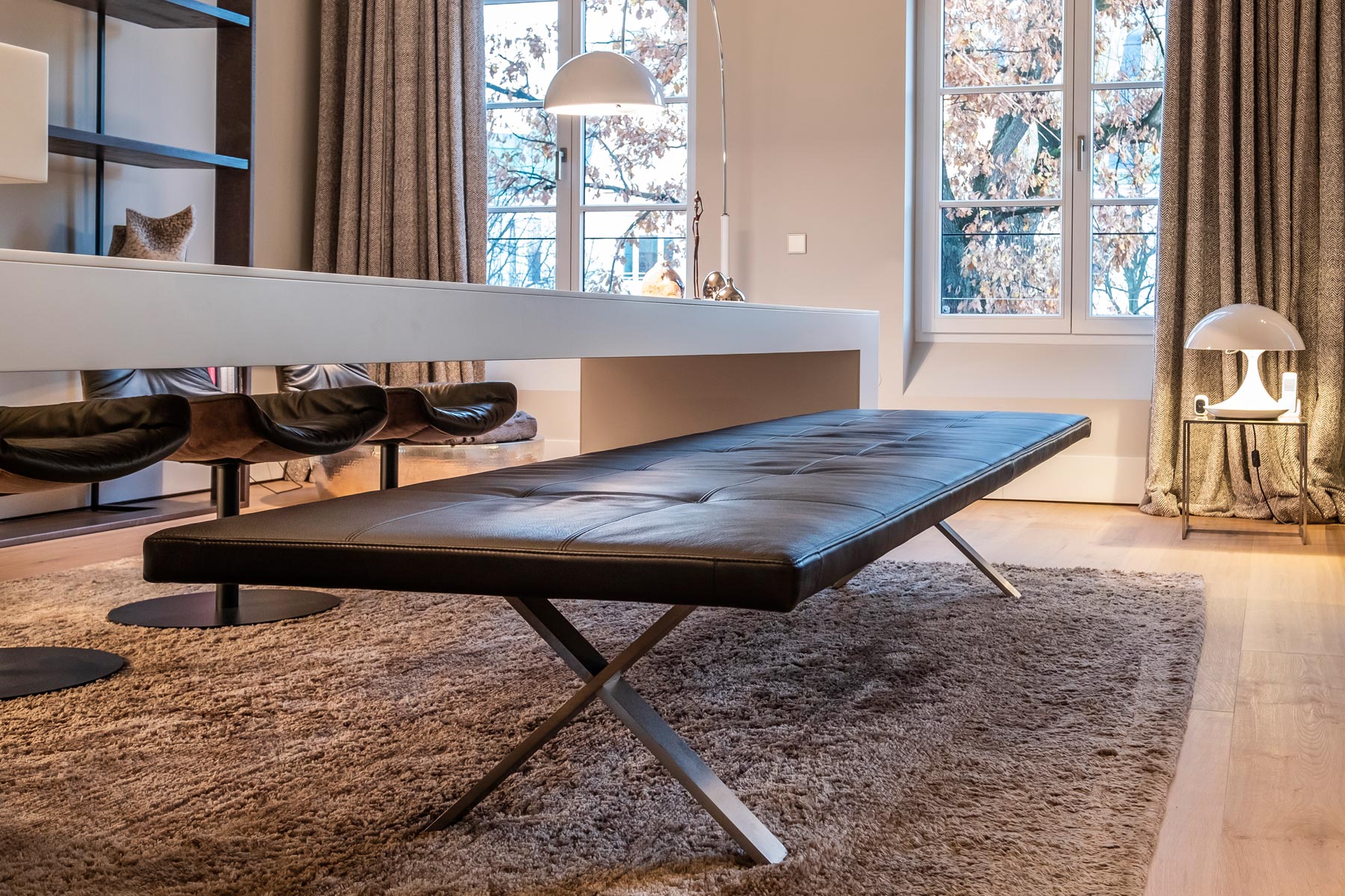 Im Wechselspiel mit der geradlinig-puristischen Innenarchitektur reagierten wir durch den Einsatz des passenden Möbelstücks (u. a. Minotti, B&B Italia, ClassiCon), mit hochwertigen Accessoires und Objekten (u. a. Gilles Caffier) oder durch textile Farbakzente auf die jeweils räumliche Situation. Wir schufen Korrespondenzen, die mal harmonierend, mal Spannung erzeugend, den Lebensräumen im Stadthaus auf vielfältige Weise eine wohnliche Schönheit verleihen.
