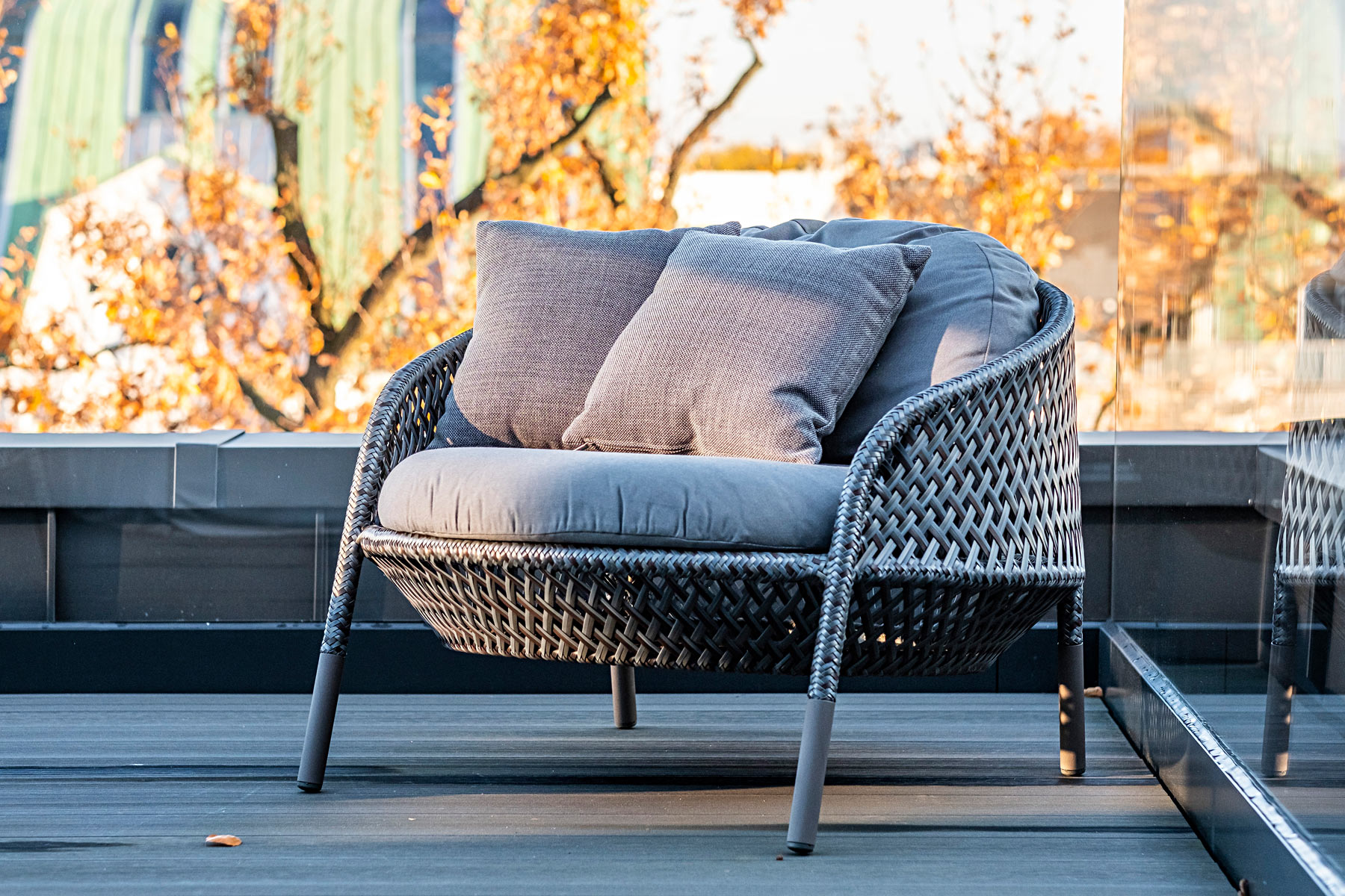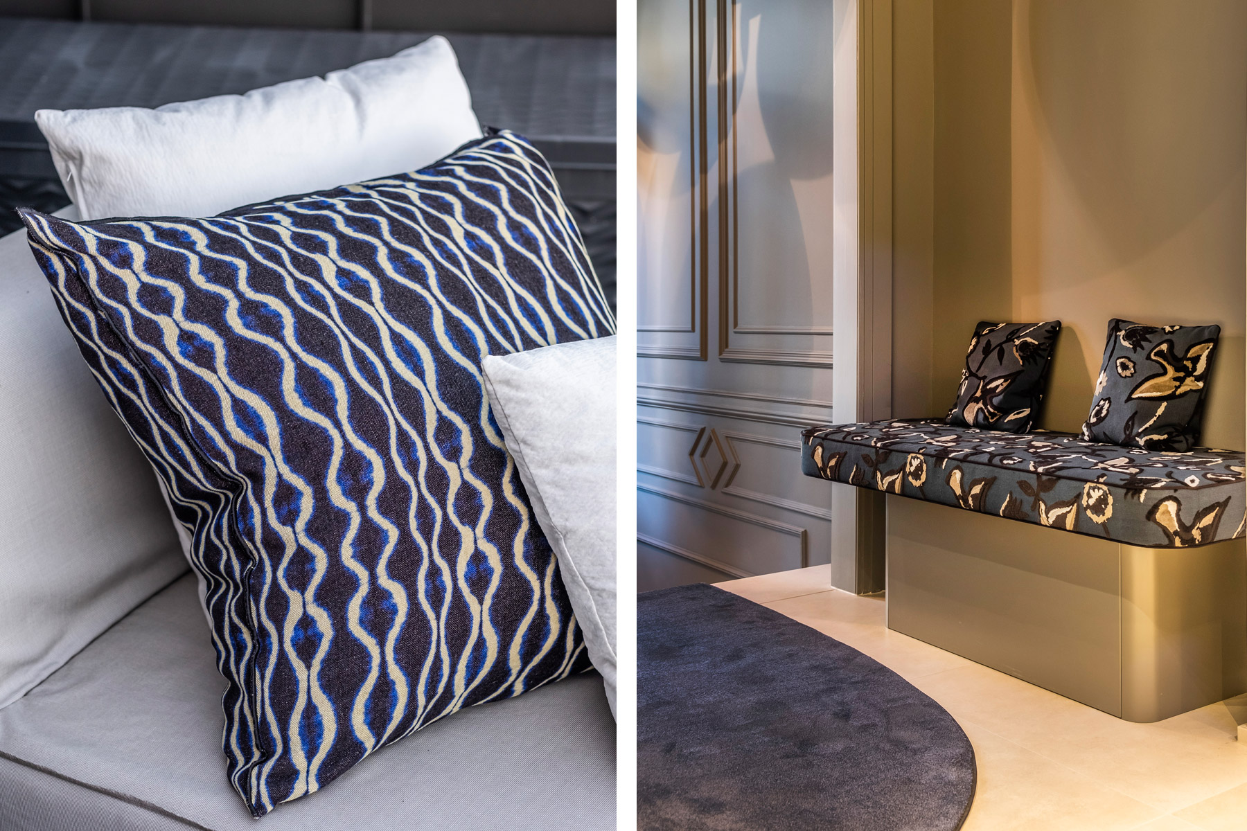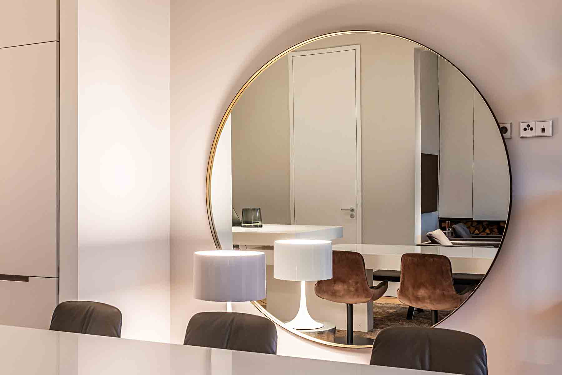 Im Wechselspiel mit der geradlinig-puristischen Innenarchitektur reagierten wir durch den Einsatz des passenden Möbelstücks (u. a. Minotti, B&B Italia, ClassiCon), mit hochwertigen Accessoires und Objekten (u. a. Gilles Caffier) oder durch textile Farbakzente auf die jeweils räumliche Situation. Wir schufen Korrespondenzen, die mal harmonierend, mal Spannung erzeugend, den Lebensräumen im Stadthaus auf vielfältige Weise eine wohnliche Schönheit verleihen.